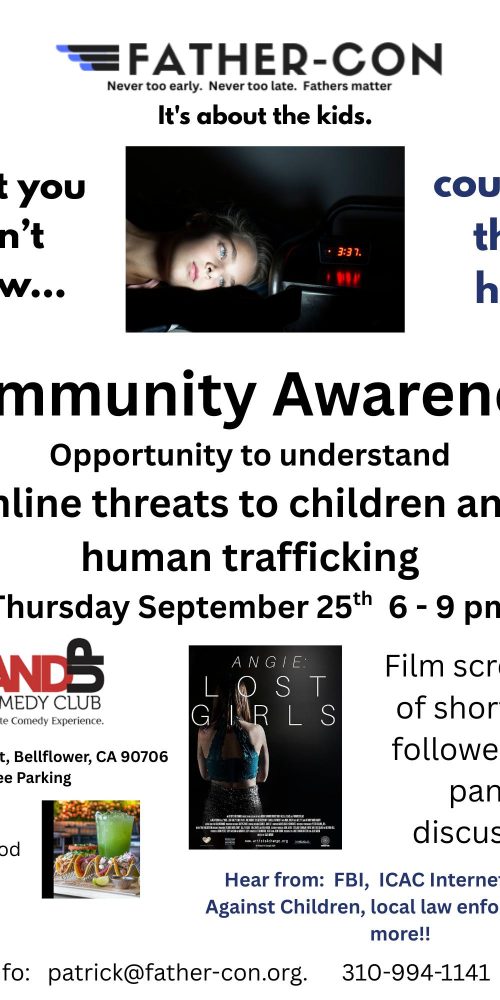 Opportunity to understand online threats to children and human trafficking. The Stand Up Comedy Club 9831 Belmont St. Bellflower, СА 90706 Thursday Sept 25th 6 - 8:30 pm Free…